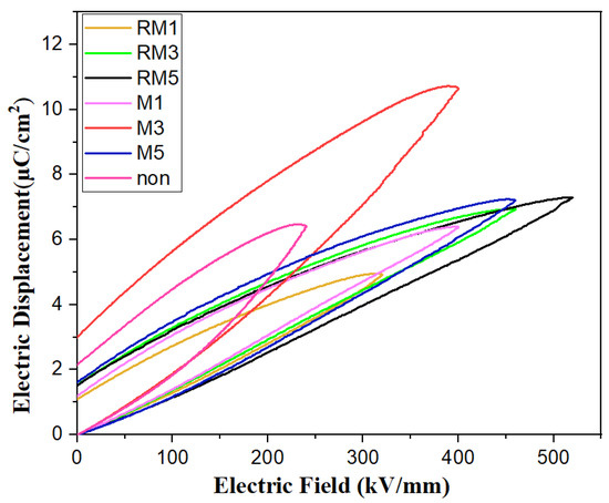 In Figure 9, the maximum potential shifts of PVDF polymer films under 240 kV/mm, 400 kV/mm, 400 kV/mm, 460 kV/mm, 320 kV/mm, 460 kV/mm, and 520 kV/mm electric fields are shown. In D–E, the hysteresis loops are 6.43 μC/cm2, 6.38 μC/cm2, 10.64 μC/cm2, 7.21 μC/cm2, 4.93 μC/cm2, 6.99 μC/cm2, and 7.29 μC/cm2, respectively. The film treated with a static horizontal magnetic field for three minutes has the maximum potential shift of 10.64 μC/cm2, but the residual polarisation value is higher at about 3.03 μC/cm2, and in combination with the XRD plot, the samples are single peaked γ phase, which may have resulted in having excellent maximum polarisation and large residual polarisation. It indicates that the magnetic field modulation favours the dielectric polarisation and reduces residual polarisation, which can effectively prevent the Joule heat generated by the residual polarisation from leading to the thermal breakdown of the film during the charging and discharging process. It coincides with the breakdown performance curve.