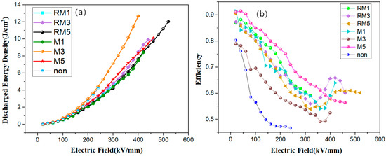 Figure 10 illustrates the discharge energy density (efficiency) values of 4.23118 J/cm3 (0.46691), 8.425 J/cm3 (0.63977), 12.68185 J/cm3 (0.52524), 10.11482 J/cm3 (0.56389), 5.03764 J/cm3 (0.59 159), 9.83199 J/cm3 (0.60142), and 12.03719 J/cm3 (0.6019). The maximum discharge energy density of the polymer film treated with a magnetic field of constant direction for 3 min is related to the fact that it has the smallest free-volume pore size of 2.91 Å, the highest γ-phase content of 54.8%, and the smallest grain size of 68 Å, and is not entirely dependent on the decoupling modulation of the dielectric properties. Because the dielectric constant and breakdown strength of some samples are greater than M3, the discharge energy density is less than M3, which is related to a combination of factors such as their free-volume hole size and γ-phase content.