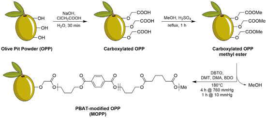OPP is described (like most wood-based materials) as a combination of lignin, cellulose, and hemicellulose. Lignin is a polysaccharidic polyphenol complex, showing an abundance of exposed aliphatic and aromatic hydroxylic moieties. Parallelly, cellulose and hemicellulose display a large abundance of primary and secondary alcoholic functionalities. In order to proceed with surface modification, it was assumed that, overall, OPP is a surface-hydroxylated structure and treated as such. Therefore, the surface-modification strategy was planned as depicted in Figure 2. First, OPP underwent carboxylation by reaction with chloroacetic acid in an alkaline environment, which led to the carboxymethylation of its nucleophilic OH groups, as previously reported for both lignin [25,26] and cellulose [25,27]. Then, carboxymethylated OPP was reacted with methanol to produce the methyl ester of carboxymethylated OPP via a common Fischer’s esterification reaction. This step was crucial to prepare the OPP surface for the grafting of PBAT, which was performed by tin-catalyzed polytransesterification of the dimethyl esters of terephthalic and adipic acids with 1,4-butanediol, adapting a procedure recently described for linear polyesters [28]. With this approach, DBTO can activate methyl ester moieties (both on the free monomer and the OPP surface) towards the nucleophilic attack of primary OH groups of 1,4-butanediol, leading to the formation of surface-grafted PBAT by the elimination of methanol by distillation.