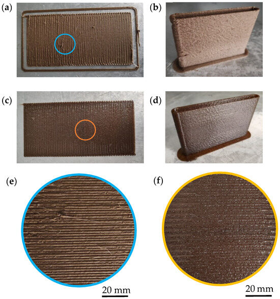 3D-printed (a) PETG15OPP XY plate; (b) PETG15OPP XZ plate; (c) PETG15MOPP XY plate; (d) PETG15MOPP XZ; (e) detail of PETG15OPP XY plate surface; and (f) detail of PETG15MOPP XY plate surface.