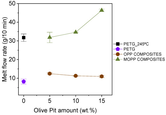 The MFR of the different composites was then studied to better understand the differences observed in the surface roughness of the composites, aiming to correlate this with their processability (Figure 6). The values obtained for the OPP composites are slightly above 10 g/10 min. This value is in the lower limit recommended in the literature for processing materials by FGF to avoid clogging problems in the printer nozzle caused by the high viscosity of the melt. Similarly, the MFR of PETG at 210 °C is also rather low, close to 10 g/10 min as well. This value increases above 30 g/10 min when tested at 245 °C (the recommended temperature for printing PETG), showing a higher flowability at this temperature, more adequate for FGF [6,35]. The MFR values of the MOPP composites are like those of PETG tested at 245 °C. This is likely caused by the coating of the MOPP, which consists of a low molecular weight PBAT with a chemical composition very similar to that of the PETG matrix. These two factors probably favor the diffusion of the MOPP within the PETG chains, decreasing the overall viscosity of the melt. Improved flowability of the material (i.e., higher MFR) facilitates better deposition and interdiffusion of the polymer layers and strands, resulting in printed objects with a more uniform composition and better mechanical properties.