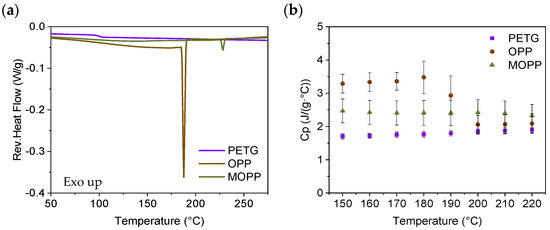 (a) MDSC curves and (b) Cp values for a range of temperatures between 150 and 220 °C for PETG, OPP, and MOPP.