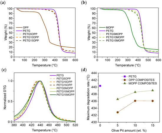 TGA was performed to complete the thermal study of the materials (Figure 8a,b). The graphs show that both OPP and MOPP composites degrade earlier than PETG, indicating a lower thermal stability of OPP and MOPP than that of the polymer matrix [38,39]. However, MOPP exhibits superior stability than OPP, which extends to the composites and increases the onset of the maximum degradation temperature (Figure 8c,d). This enhanced thermal stability is in agreement with our results previously observed by MDSC and has been reported in the literature for agro-waste, whose compatibility with the matrix was improved through the use of additives [40].