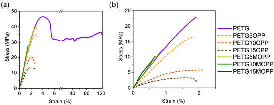 The tensile strength (Figure 10b) values decrease linearly for both OPP and MOPP composites of the XY-printed specimens, as the additives have worse mechanical properties than PETG. However, MOPP composites show higher strength than OPP composites. The results in the XZ orientation follow a different trend. Although the maximum strength also decreases in all composites, PETG5OPP shows higher strength than PETG5MOPP, likely due to the low concentration of additives, minimizing their aggregation in the PETG matrix. However, as the OPP content increases, the strength in the XZ orientation decreases linearly, while the strength values are maintained in the MOPP composites. The presence of both OPP and MOPP limits the movement of the PETG chains, resulting in material failure at much lower deformations in the XY specimens, as observed in the elongation at break values of Figure 10c). In this case, the surface modification with PBAT does not seem to enhance the ductility of the material, even when compared to OPP composites. This effect is also observed for the XZ specimens, where all materials tested break at values below 3% strain. While the OPP composites can withstand lower loads, they are able to deform to a larger extent, showing a certain plastic behavior. This is not observed in the case of the MOPP composites, which exhibit a brittle fracture when they break. This indicates that there must be a series of supramolecular interactions between PETG and the PBAT coating, which contribute to increasing the interlayer adhesion and improving the stiffness (Young’s modulus) and tensile strength of the MOPP composites, but it is not able to contribute to reaching larger deformations than the OPP composites or PETG [41].
