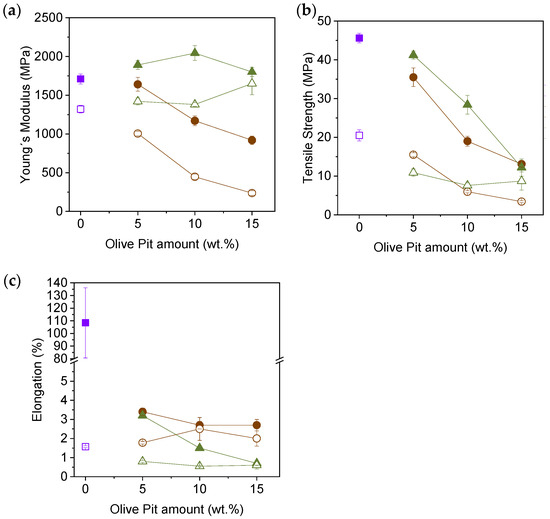 (a) Young’s modulus, (b) tensile strength, and (c) elongation at break values of printed PETG (purple), OPP composites (brown) and MOPP composites (green). Filled and howllow symbols represent XY- and XZ-printed specimens, respectively.