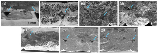 Low-magnification SEM images of the fracture surface of XY tensile testing specimens of (a) PETG; (b) PETG5OPP; (c) PETG10OPP; (d) PETG15OPP; (e) PETG5MOPP; (f) PETG10MOPP, and (g) PETG15MOPP. Blue arrows indicate voids between layers and beads. Scale bar in (a) is applicable to all images.