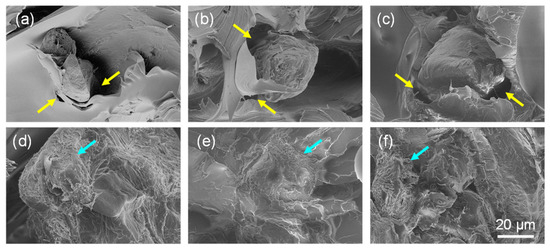 This interaction of the OPP and MOPP with the polymer matrix is better illustrated in the high-magnification SEM images in Figure 12. The low-magnification images in Figure 11 showed very porous materials in the case of the OPP composites, but when the magnification is increased, the individual OPP particles can also be observed within this foamy structure. The OPPs also have gaps around them (indicated with yellow arrows in Figure 12a–c), demonstrating their poor integration into the PETG matrix [12,33,43]. In contrast, this does not occur in the MOPP composites, where the MOPP is well integrated within the PETG matrix, presenting a rougher morphology in the fracture surface. This proves why, in general, the MOPP composites presented higher mechanical properties than the OPP composites and also explains the higher stiffness obtained in some of the MOPP composites, which was even higher than that of the PETG matrix.