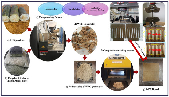 WPC preparation involved the compounding and consolidation of two compositions of LLB particle reinforcements (40 and 60 wt.%). Formulations involving a total of 20 samples, including unreinforced polymer matrices of rLLDPE, rMDPE, rHDPE, and their blend (EM) with equal composition (33/33/33 by wt.%), are shown in Table 2. The first letter of the polymer matrix is used with the subscript number to indicate their compositions in the matrix composites, and LB represents the LLB particle reinforcement. During compounding, the polymeric matrix was added to the preheated mixing chamber (HAAKE Reomix) and melted for approximately 5 min at 150, 160, 170, and 165 °C for rLLDPE, rMDPE, rHDPE, and rEM, respectively. Subsequently, the dried LLB particles and MAPP were added and homogeneously compounded for an additional 10 min until constant torque and viscosity were achieved. Finally, the dried WPC granules were further reduced using a cutting mill (model SM 2000, Retsch GmbH, Haan, Germany) with a mesh size of 8 mm. The consolidation of the WPC boards was performed in a computer-controlled hot-compression press with a steel mold frame of dimensions of 180 mm × 200 mm × 4 mm. This process involved cycles of low-pressure melting for 1 min, compression at 20 bar for approximately 8 min, continuous pressing by increasing the pressure to 60 bar for the next 2 min, and pressing at 100 bar for an additional 2 min. While maintaining a constant pressure at 100 bar, pressing continued cooling with an external water coolant flow until the temperature decreased to less than 80 °C for an additional one minute. Finally, the WPC board prototype was removed from the frame.