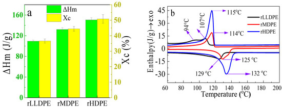 Figure 3a,b shows the DSC data of rLLDPE, rMDPE, and rHDPE, including their XC and ΔHm. The Tm and Xc for the recycled PEs differ, as shown in Figure 3b. Recycled LLDPE exhibits the lowest Xc (a), with a broad, small, and less sharp melting peak (b), which is related to its large amorphous content. In contrast, both rMDPE and rHDPE maintained sharp crystallinity and melting properties, with rHDPE having a larger Xc value than rMDPE, which is consistent with the reported literature values for virgin PE with minor differences. For instance, rLLDPE was reported to have a weak crystallization peak at approximately 95 °C, followed by a sharp Tc at 109 °C, and a sharp Tm at approximately 123 °C. Similarly, virgin HDPE and MDPE were reported to have ΔHm values of 152.89.7 and 144.3 J/g, respectively. [48]. Furthermore, a recent investigation on the DSC characteristics of four different neat PE polymers showed Xc values of 36.65%, 39.52%, 48.35%, and 51.28% for LDPE, LLDPE, MDPE, and HDPE, respectively [53,54]. These results are similar to our study findings, in which the Xc values were found to be 39.54%, 46.64%, and 51.08% for rLLDPE, rMDPE, and rHDPE, respectively. The slight variations are ascribed to the thermal processability affecting the crystallization of the polymer, with similar retained properties as their virgin counterparts. These results imply that thermomechanical recycling can retain properties like those of the respective virgin polymers and can be used as a secondary resource.