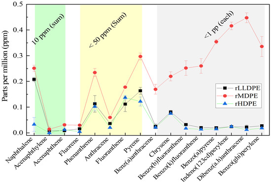 PAHs are hydrocarbons composed of multiple aromatic rings, which are recognized for their toxicity, carcinogenicity, and mutagenicity. Common PAHs and their detected amounts, including their threshold quantities, are shown in Figure 4. The combined total amounts of naphthalene, acenaphthylene, acenaphthene, and fluorene should be below 10 mg/kg. Similarly, the amounts of residual phenanthrene, anthracene, fluoranthene, and pyrene molecules must remain below 50 mg/kg (ppm), according to well-established standards for protection of the PAHs [45]. Benzo(a)anthracene, chrysene, benzo(b)fluoranthene, benzo(k)fluoranthene, benzo(a)pyrene, indeno(1,2,3-cd) pyrene, dibenzo(a, h)anthracene, and benzo(ghi)perylene concentrations did not exceed 1 mg/kg. The rMDPE has relatively high concentrations of polycyclic arenes compared with both rHDPE and rMDPE. The sources of theses PAHs could be residual impurity traces coming from their corresponding monomer and/or polymer productions, catalyst residuals and different impurities associated with additives during the productions. However, the PAHs levels detected in rLLDPE, rMDPE, and rHDPE complied with these requirements, making them suitable for valorization as secondary resources for the WPC core-matrix polymers. However, the evaluation requires continuous testing.