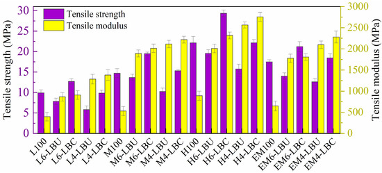 As shown in Figure 5, WPCs formulated from the lower contents of the bamboo particles (40%) showed larger TS than those with 60%. This indicates a decreasing trend in TS with increasing bamboo particle loading, whereas the TM (stiffness) increases. Adding bamboo particles to a polymer matrix significantly enhanced the stiffness of both the coupled and uncoupled composites. The TM of both coupled and uncoupled WPCs with 40% bamboo particles, L6–LBU, L6–LBC, M6–LBU, M6–LBC, H6–LBU, H6–LBC, EM6–LBU, and EM6–LBC, were improved significantly with increasing ratios of 2.2, 2.3, 3.6, 3.8, 2.3, 2.6, 2.7, and 2.8, respectively, compared with that of unreinforced rLLDPE, rMDPE, rHDPE, and rEM. Furthermore, increasing the particle reinforcement to 60% from 30% increased the stiffness of the composites. Thus, the TM of 60% bamboo particles of both coupled and uncoupled composites, i.e., L4–LBU, L4–LBC, M4–LBU, M4–LBC, H4–LBU, H4–LBC, EM4–LBU, and EM4–LBC, increased by the ratios of 3.2, 8, 4, 4.2, 2.8, 3.1, 3.2, and 3.5, respectively, compared with the respective reinforced matrices. This depicts the pronounced effect of bamboo particles on increasing the stiffness of the composite compared with the coupling agents, which increased the TM to a maximum of 15%. Unlike TM, TS did not increase proportionally with the bamboo particle content in the composites without coupling agents because of fiber agglomerations that hinder the polymer chain encapsulation and weak adhesion. Nevertheless, for 40% bamboo particles of coupled WPCs, i.e., L6–LBC, M6–LBC, H6–LBC, EM6–LBC, the TS significantly increased by 27.8%, 32.5%, 32.6%, and 55.7%, respectively, compared with unreinforced polymeric matrices rLLDPE, MDPE, rHDPE, and EM. 40% bamboo particles of coupled WPCs also demonstrated 61.78%, 42.72%, 34%, and 51.3% increases compared with their respective uncoupled L6–LBU, H6–LBU, EM6–LBU composites, respectively. Similarly, the TS of coupled WPCs with 60% bamboo particles, i.e., L4–LBC, M4–LBC, H4–LBC, and EM4–LBC, showed significant increases of 68%, 49.3%, 46.1%, and 46%, respectively, compared with their respective uncoupled composites L4–LBU, M4–LBU, H4–LBU, and EM4–LBU. This trend shows that the MAPP compatibilizer enhances the interface compatibility, whereas composites without a coupling agent exhibit weak interphase compatibility, reducing the TS. This work achieved better results than WPCs produced from smaller particles and flour. In particular, the reported TS was 9.5–23.2 MPa for 30–50% dispersed phase, 3% MAPP (Epolene G-3015), and maleic-anhydride-grafted PE (MAPE). This improvement can be ascribed to the wider distribution of LLB particle reinforcement, higher cellulose content, or probably residual impurities that may enhance interactions, and higher grafted portions of MA in MAPP [55,56,57].
