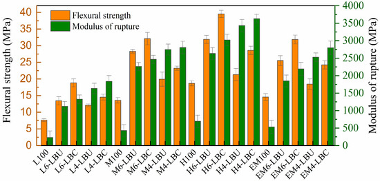 The FS and FM results are shown in Figure 6. The FS of the formulated composites increased for both coupled and uncoupled composites compared with that of the core polymer, unlike the TS. Bamboo-particle reinforcement improved the low FS of all unreinforced matrices. However, the FS decreased slightly with increasing bamboo particle contents. Similarly, the FM was improved compared with that of the unreinforced composites, exhibiting increasing trends with increasing LLB content. The FM of both coupled and uncoupled WPCs with 40% LLB particles, i.e., L6–LBU, L6–LBC, M6–LBU, M6–LBC, H6–LBU, H6–LBC, EM6–LBU, and EM6–LBC, were significantly improved by the ratios of 4.3, 4.9, 5.3, 5.8, 3.8, 4.4, 3.6, and 4.1, respectively, compared with unreinforced rLLDPE, rMDPE, rHDPE, and rEM. Similarly, FM uncoupled and coupled WPCs with 60% LLB particle, i.e., L4–LBU, L4–LBC, M4–LBU, M4–LBC, H4–LBU, H4–LBC, EM4–LBU, and EM4–LBC, resulted in increasing trends of 7.1, 7.9, 6.4, 6.5, 5, 5.2, 4.7, and 5.3 ratios, respectively, compared with their unreinforced matrices of rLLDPE, rMDPE, rHDPE, and rEM. However, FM only marginally increased with MAPP inclusion at both 40% and 60% LLB particles.