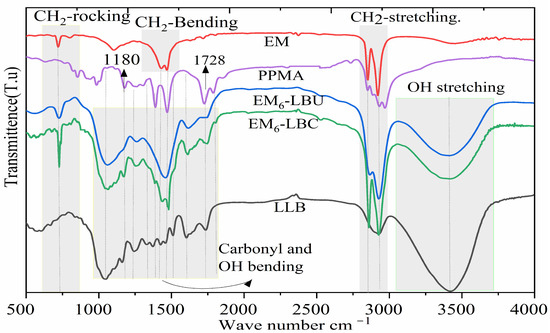 As shown in Figure 9, MAPP reduces the –OH functionalities of the LLB particles, as depicted by the weakening of the OH stretching at approximately 3430 cm−1 and C–O lignin stretching at approximately 1050 cm−1 [27] with changes in the peak intensity length, denoting chemical changes [70]. Additionally, several typical vibration peaks of cellulose, hemicellulose, and lignin biomass in the complex regions of 1152–1755 cm−1 were affected compared with those of the coupled composites. These included OH– in-plane bending and lignin C–H bending in CH3 at 1454 cm−1, lignin aromatic skeleton vibrations at 1508 cm−1, and C–H bending at 1462 cm−1. Moreover, hemicellulose COO stretching, lignin C–O stretching, hemicellulose (C–O stretching in carboxylic acid), and lignin (C–C, C–O, C=O) stretching are noted at 1380, 1264, 1240, and 1226 cm−1, respectively [62,63]. Compared with LLB, some of these absorption peaks disappeared and/or shifted to lower or weaker intensities in the coupled WPCs. The anhydride carbonyl group of MA in PP (1180 cm−1) was detected in the coupled composites. Although the LLB particles have an ester band region at approximately 1728 cm−1 [70], compared with the EM6–LBC composites, this band region was clearly observed in EM6–LBC. Similarly, the CH2-stretching vibration peaks at 2920 and 2852 cm−1 and CH2-bending vibrations were more intense in the EM6–LBC systems than in EM6–LBCU, implying improved interactions with the hydrophobic blend chains. These phenomena indicate synergetic interphase modification with MAPP and polymer blending, resulting in improved mechanical properties, as observed during mechanical property characterization. A relatively weak peak around 1093 cm−1 and 870 cm−1 in the EM most likely represent the out-of-plane and in-plane bending vibrational modes of CO32− in CaCO3, confirming the presence of this mineral filler in the recycled PE waste [71].