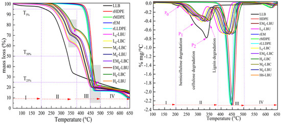 The WPCs containing MAPP exhibited higher thermal stability than the uncoupled composites because of the improved interfacial force and encapsulation of the fibers within the polymeric matrix. Similarly, it shifted T5% and Tmax at the end of region III to higher values. Specifically, in region III between T50% and T15%, the Tmax of the WPCs of EM and rHDPE with MAPP exceeded the degradation temperature of their corresponding matrix with increased residue [72]. It was reported that MAPP improved the interphase and catalytically carbonized [73] and promoted the release of high-carbon char from lignin, which acted as a thermal barrier during its wide thermal degradation range because of its stable aromatic phenyl groups [74]. This phenomenon enhanced the thermal stability of the coupled melt-blended WPCs of the polymers in region III compared with the unreinforced polymeric matrix and coupled and uncoupled WPCs based on rLDPE and MDPE. Additionally, EM-based composites benefit from the high thermal stability of the rHDPE matrix, improved fiber encapsulation, and efficient dispersion due to MAPP. The Tmax of the EM matrix (477.9 °C) in region III shifted to 486.8 °C in EM6–LBC, realizing complete oxidation at temperatures above 500 °C. However, beyond 500 °C at the end of region III, the carbonization effects of the LLB decreased, leading to complete WPC degradation. Free radicals from coupling agents and polymer matrix degradation catalyzed composite pyrolysis and increased reactivity, resulting in minimal differences in the remaining mass at 650 °C compared with LLB [73,75]. However, with the rising temperature the detectable decomposition ranges is revealed around 600 °C with 6.24% mass loss. This second phase could originate from the slow pyrolysis of inorganic mineral fillers such as CaCO3 as high amounts of Ca were found in our previous determination of metal additives.