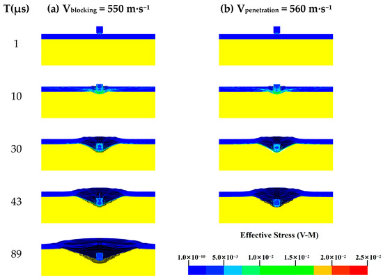 The Von Mises stress contour map of the FSP penetrating the body armor target plate: (a) Vblocking = 550 m·s−1; (b) Vpenetration = 560 m·s−1.