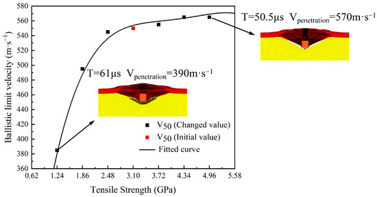 From the trend in ballistic limit velocity of the body armor target plate with tensile strength shown in Figure 6, the ballistic limit velocity V50 of the body armor target plate generally shows an upward trend with the increase in tensile strength. When the tensile strength of the body armor target plate is less than 2.48 GPa, the slope of the fitted function curve increases rapidly, and its ballistic limit velocity V50 begins to decrease significantly, indicating a substantial reduction in the penetration resistance of the body armor target plate. When the tensile strength of the body armor target plate exceeds 2.48 GPa, the slope of the fitted function curve gradually levels off, and further increases in tensile strength have an insignificant impact on the ballistic limit velocity V50, resulting in only slight increases. By analyzing the failure modes at tensile strengths of 1.24 GPa and 4.96 GPa, it can be observed that the increase in tensile strength is accompanied by an increase in tensile deformation. This trend shows that as tensile strength increases, the material’s ability to resist tensile failure also correspondingly improves. In the later stages of fragment penetration of the body armor target plate, excellent tensile performance becomes particularly important, as the failure mode of the body armor target plate at this stage primarily manifests as tensile failure. Therefore, the higher the tensile strength, the greater the tensile deformation the material can withstand until the tensile deformation reaches the critical point of failure.