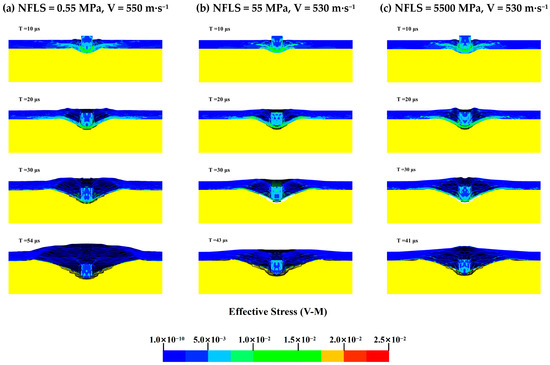 The Von Mises stress contour map of the body armor target plate: (a) NFLS = 0.55 MPa, V = 550 m·s−1; (b) NFLS = 55 MPa, V = 530 m·s−1; (c) NFLS = 5500 MPa, V = 530 m·s−1.