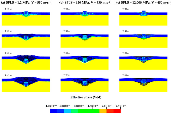 The Von Mises stress contour map of the body armor target plate: (a) SFLS = 1.2 MPa, V = 550 m·s−1; (b) SFLS = 120 MPa, V = 530 m·s−1; (c) SFLS = 12,000 MPa, V = 450 m·s−1.