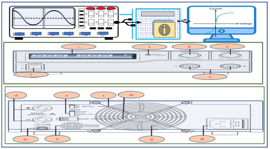 Klaipeda University programmed the laboratory switching mode power supply system, which includes the HCS-3602-USB power supply (i–xiii, display (i), indicator (ii), voltage regulator (iii), current regulator (iv), on–off switch (v), auxiliary current output up to 5 A (vi), high current output (vii), sensor input (viii), control mode switch (ix), recall switch (x), connection to computer (xi), cooling fan (xii), power cord socket (xiii), USB connection (xiv)), including variable frequency voltage source with the flyback transformer (17–50 kHz), high-voltage cables, and using data acquisition equipment for NTP [53].