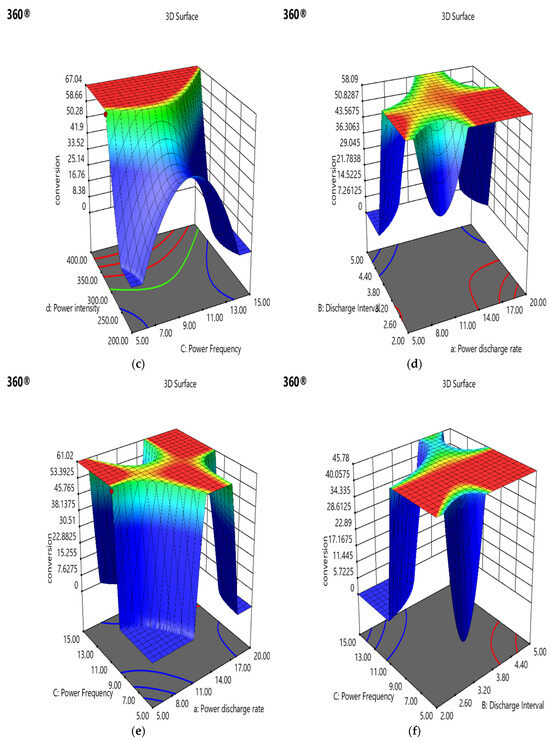 (a–f) Three-dimensional response plots for NTP parameter interactions (units of the axis labels: conversion in %; power discharge rate in W; discharge interval in ms; power frequency in kHz; power intensity in kV).