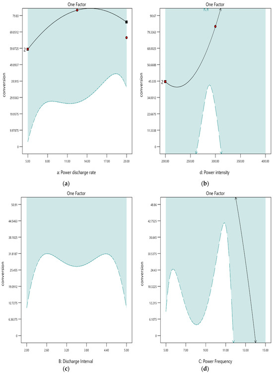 Figure 4a–d shows the apparent effect of a single factor on the response factor (Yconv%). The Yconv% values ranged between 59.87–63.58% and 79.83–81.03% because of variations in (Figure 4a). Tuning the value can show a significant effect within a specified range. The Yconv% values range from 45.33% to 91.03% for the 260–310 kV range (Figure 4b). Optimising the and factors led to a narrow Yconv% range of 48.86–50.91% (Figure 4c,d).