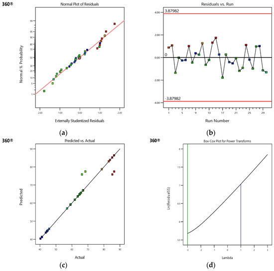 The State-Ease 360® software presents a diagnostic Box–Cox plot (Figure 5d). This plot can be used as a reference for determining the optimal λ value for the power law transformation. Figure 5d shows the natural log of the sum of squared residuals (ln residual SS), with λ values ranging from −3 to +3 at the interval of 0.2. The best λ value was seen to correspond to the minimal ln residual value, resulting in a scale that fulfils the equal variance criterion presented in the ANOVA model. This λ value was restricted by the upper and lower 95% confidence ranges. If the 95% confidence interval for λ contained λ = 1 (i.e., no transformation), the software failed to suggest a specific transformation. If not, a particular λ was recommended. However, power law transformation cannot be applied to the responses <0; therefore, a constant (k) was added to each response. The proposed transformation produced the lowest value for the ln residual SS. Additionally, the researchers used the Box–Cox graph transformation (Figure 5d) to identify if data transformation was needed for response modelling. The actual value (λ = 1) ranged between the low and high confidence ranges (−2.89 and 1.34), eliminating the need for model transformation. This indicates the absence of variance and the analytical hypothesis was satisfied.
