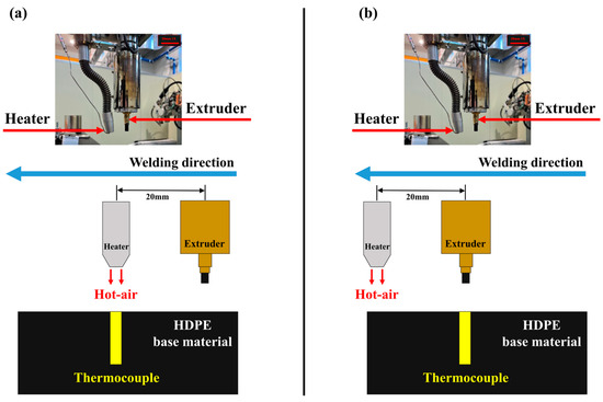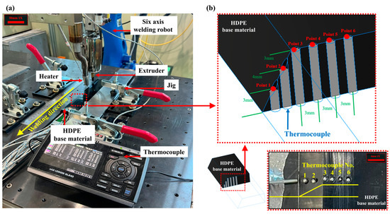 To ensure consistent welding process parameters, an extrusion-type extruder (Sinwoo (Seoul, Republic of Korea), D4) capable of wire-based welding was attached to a six-axis articulated robot (Yaskawa (Kitakyushu, Japan), MH6). A hot air blower was mounted in front of the welding equipment’s travel direction to preheat the HDPE base material by applying hot air at a constant temperature, with the blower maintaining a 90° working angle relative to the base material. To measure the preheating temperature based on the thermocouple positions within the base material, a data logger (Graphtec (Yokohama, Japan), GL240) equipped with thermocouples was used. A custom clamp-type jig was employed to fix the positions of the thermocouples and the base material. During the preheating experiments simulating the welding process, temperature changes over time were measured at specific points where the thermocouples were attached to the base material. Figure 1 shows the configuration of the experimental equipment used in this study and the thermocouple attachment points.