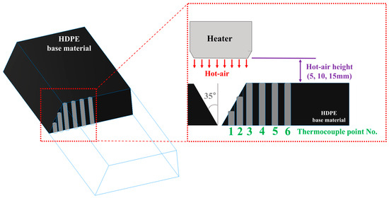 An experimental plan was developed to analyze the changes in preheating temperature of the HDPE base material based on hot air movement speed and hot air height, which could affect the preheating temperature of the base material, with the hot air temperature being maintained at 258.2 ± 3.5 °C. Table 2 presents the experimental design for analyzing the preheating temperature changes in the HDPE base material according to the welding process parameters, while Figure 2 shows a schematic diagram of the welding process parameters. The hot air height was measured based on the position where the welding equipment, maintaining a 90° working angle relative to the HDPE base material, makes contact and starts applying pressure in the actual HDPE welding process. The hot air movement speed was calculated as the joining speed that can form a good bead while filling the entire volume of the v-groove improvement processed at 35° in the butt joint based on the material throughput specifications of each stage of the used joining equipment. Since the hot air blower is attached to the welding equipment, the welding speed was used as the hot air movement speed in the experimental design.