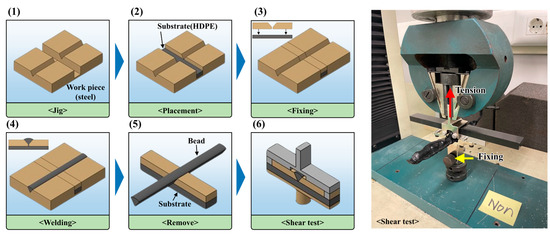 To analyze and discuss the changes in the preheating temperature of the HDPE base material according to the welding process parameters, we compared joints without preheating and those preheated with hot air. The joining experiment used a 4 mm diameter HDPE wire (Röchling-ReLoop (Worms, Germany), HDPE). It has a melt index of 0.12 g/min, a crystallization temperature of 120 °C, and a melting point of 130 °C. To prevent preheating temperature differences due to varying geometries, the Bead-on-Plate (BoP) method was employed. The welding experiment was conducted under consistent conditions of a 5 mm preheating height, a 1.8 kg/h material throughput, and a 35 cm/min hot air movement speed. To analyze the effect of preheating on the joints, a shear test was performed. The shear test was conducted using a universal testing machine (Tinius Olsen(Redhill, UK), H10KS), where the base material was fixed with a jig and the welded bead was pulled in the opposite direction of gravity at a speed of 5 mm/min. A self-made shear jig was used for the shear test, and a schematic diagram is shown in Figure 3. The shear test was performed with 5 repetitions, resulting in an error of at least 2.3%