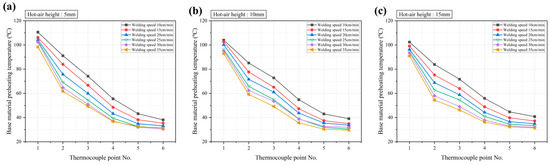 Since the preheating temperature of the base material when the wire extrusion unit of the welding equipment is positioned at the thermocouple attached to the base material is the actual preheating temperature during welding, this temperature is referred to as the preheating temperature at the moment of welding. The results were analyzed based on this definition. Figure 5 shows the preheating temperature measurements at different points within the base material at the moment of welding. Figure 5a–c confirm that as the hot air movement speed increased, the preheating temperature of the base material decreased linearly regardless of the thermocouple position or hot air height. Additionally, under the same conditions, the preheating temperature decreased as the hot air height increased, and as the thermocouple points were located further from the center of the base material, the preheating temperature also decreased. Among the six position points, positions 1 to 4 showed clear trends in temperature increase and decrease, while positions 5 and 6 exhibited less deviation compared to positions 1 to 4.