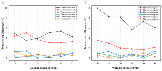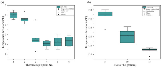 Under the same hot air conditions, despite the thermocouple at position 3 being located lower than that at position 1 due to the v-groove geometry, the maximum temperature was observed at position 1 rather than position 3. This suggests that the distance from the center of the hot air flow has a greater effect on the preheating temperature than the height of the hot air. This result is also evident in Figure 6, which shows that the temperature deviation based on the thermocouple position was larger than the deviation due to the hot air height. As shown in Figure 6a, the difference in temperature due to the hot air height was small, with a maximum difference of 4.5 °C. The temperature deviation at positions 3 to 6 was about 1 °C and showed similar results, while positions 1 and 2 exhibited relatively higher temperature deviations. These results indicate that the influence of hot air height is concentrated at positions 1 and 2, with less effect on positions 3 to 6. From the results in Figure 6b, it is confirmed that the temperature deviation decreased as the hot air height increased. This is believed to be due to the reduction in the temperature of the hot air as the distance from the base material’s surface increased, leading to less direct contact with the surface.