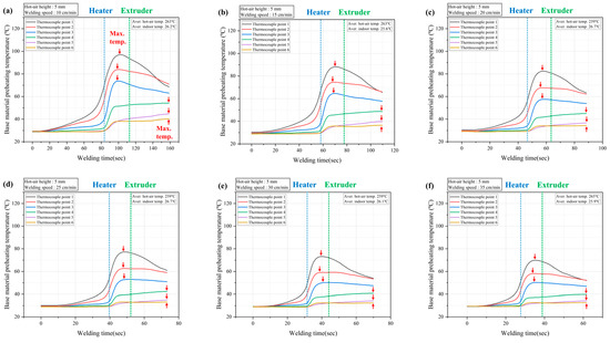 Changes in preheating temperature over time: welding speeds of (a) 10 cm/min, (b) 15 cm/min, (c) 20 cm/min, (d) 25 cm/min, (e) 30 cm/min, and (f) 35 cm/min.
