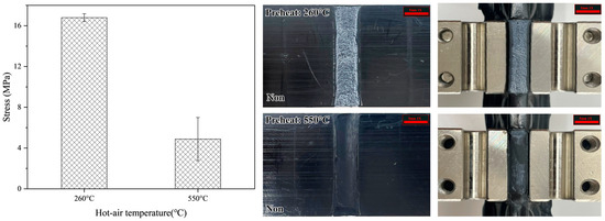 Having confirmed that preheating the surface of the base material impacts the welding performance, a comparison was made to analyze the difference in shear stress based on different preheating temperatures. The shear stress results of a joint preheated at a hot air temperature of 550 °C were compared with those of a joint preheated at a hot air temperature of 260 °C. Figure 10 shows the shear stress results for joints preheated at the two hot air temperature conditions of 260 °C and 550 °C. While the joint preheated at a hot air temperature of 260 °C showed a higher shear strength than the non-preheated joint, it was found that the shear stress of the joint preheated at a hot air temperature of 550 °C was lower than that of the joint preheated at a hot air temperature of 260 °C. This result indicates that excessive melting in the welding process of HDPE material can reduce the joint strength. The reduction in shear stress is likely due to the unraveling of numerous polymer chains as a result of excessive melting, as polymer chains have different lengths and therefore unravel at different temperatures [41,42,43,44]. Thus, selecting appropriate preheating temperature is essential for the welding process of HDPE materials.