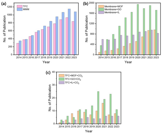 Number of published papers on (a) TFC membrane and MMM, (b) membranes with three types of additives (MOFs, GOs, and ILs), and (c) TFC membranes with three types of additives (MOFs, GOs, and ILs) for CO2 separation over the last ten years (2014–2023), with data obtained from the Web of Science (https://www.webofscience.com/wos/woscc/basic-search, accessed on 9 September 2024).