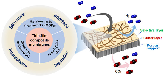 Thin-film composite (TFC) membranes containing various fillers and additives present an effective alternative to conventional dense polymer membranes, which often suffer from low permeance (flux) and the permeability–selectivity tradeoff. Alongside the development and utilization of numerous new polymers over the past few decades, diverse additives such as metal–organic frameworks (MOFs), graphene oxides (GOs), and ionic liquids (ILs) have been integrated into the polymer matrix to enhance performance. However, achieving desirable interfacial compatibility between these additives and the host polymer matrix, particularly in TFC structures, remains a significant challenge. This review discusses recent advancements in TFC membranes for CO2/N2 separation, focusing on material structure, polymer–additive interaction, interface and separation properties. Specifically, we examine membranes operating under dry conditions to clearly assess the impact of additives on membrane properties and performance. Additionally, we provide a perspective on future research directions for designing high-performance membrane materials.