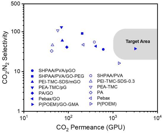 CO2/N2 selectivity vs. CO2 permeance of dry TFC-MMMs with various GOs reported in the literature. Unfilled symbols represent TFC membranes without the addition of GO fillers.