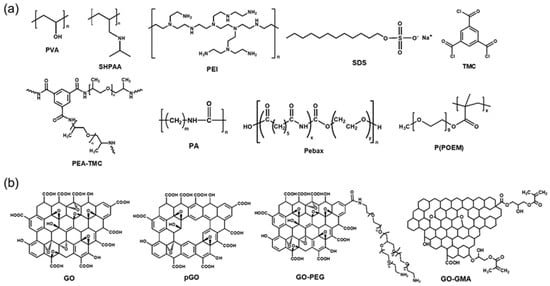 Various graphene derivatives have also been incorporated as fillers in polymer matrices to form MMMs. GO with a thickness in the nanometer range and high mechanical strength allows the tuning of intrinsic nanochannels between the adjacent layers of TFC membranes [124,125,126,127,128,129,130,131,132,133]. This allows the effective separation of small gas molecules. In addition, the abundant functional groups of GO can strengthen the interactions between permeants and the membrane. However, some aspects of the GO transport mechanism remain unclear; therefore, further research is required [134,135]. Other derivatives, such as reduced GO (rGO) and graphene quantum dots (GQDs), have also been introduced as fillers. The CO2/N2 separation performance of dry TFC-MMMs with various GO fillers reported in the literature are shown in Figure 5 and Table 2. The chemical structures of polymers and GOs are shown in Figure 6. Only one MMM containing GOs showed excellent separation performance, which lies in the commercial target area for CO2/N2 separation.