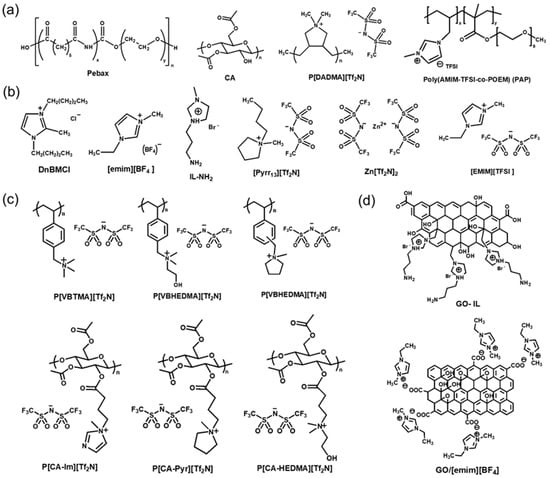ILs, which are organic molten salts that exist in a liquid state at room temperature and under pressure, have been utilized as additives to improve the separation properties of polymer membranes [143,144,145,146,147,148,149,150,151,152,153]. ILs can capture and adsorb CO2 gas by leveraging the free volume between cations and anions in the lattice, thus interacting with various gases by changing the ion type [154,155]. Despite these advantages, the low capillary force holding the ILs in a composite membrane cannot withstand a high-pressure drop; therefore, they cannot meet the requirements for practical utilization. To overcome this limitation, alternative techniques, such as mixing ILs with compatible polymers, have been developed [156]. A poly(ionic liquid) (PIL) is also an effective alternative because it has both the advantages of ILs and the improved mechanical stability of polymers. The polymer backbone and IL ion type directly affect gas separation performance. The CO2/N2 separation performance of dry TFC-MMMs with various ILs reported in the literature are shown in Figure 7 and Table 3. The chemical structures of polymers and ILs are shown in Figure 8. The performance of only a few membranes containing ILs meets the commercial target for CO2/N2 separation.