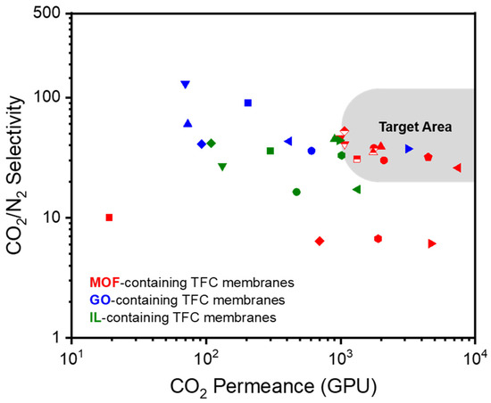 CO2 permeance (in GPU) vs. CO2/N2 selectivity of dry TFC membranes with three types of additives reported in the literature (red: MOF fillers, blue: GO fillers, green: IL fillers).