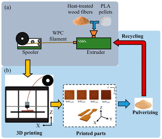 Schematic diagrams of manufacturing for a WPC filament (a) and 3D printing and recycling for a WPC part (b).