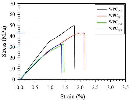 The tensile stress-strain curves and tensile properties of various WPC filaments (WPCfs) obtained from the recycling of 3D-printed WPC parts (WPCps) are presented in Figure 3 and Table 1.