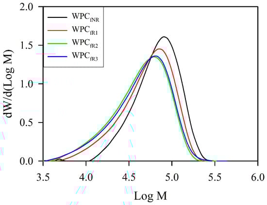 Figure 5 and Table 2 present the molecular weight distributions (MWDs) of various recycled WPC filaments and their corresponding values: number average molecular weight (Mn), weight average molecular weight (Mw), and polydispersity index (PDI).