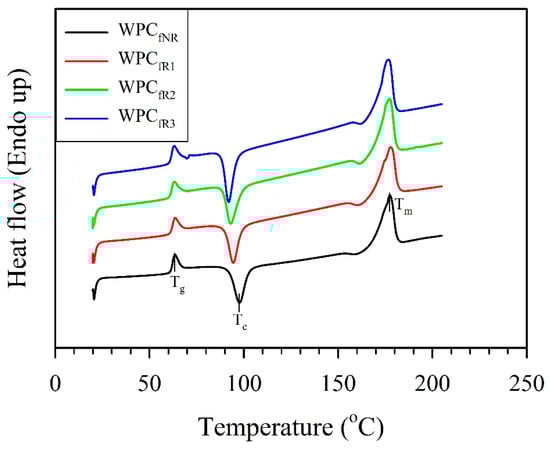 As illustrated in Figure 6 and Table 3, DSC curves were obtained to investigate the effect of recycling on the thermal properties of the WPCfs.
