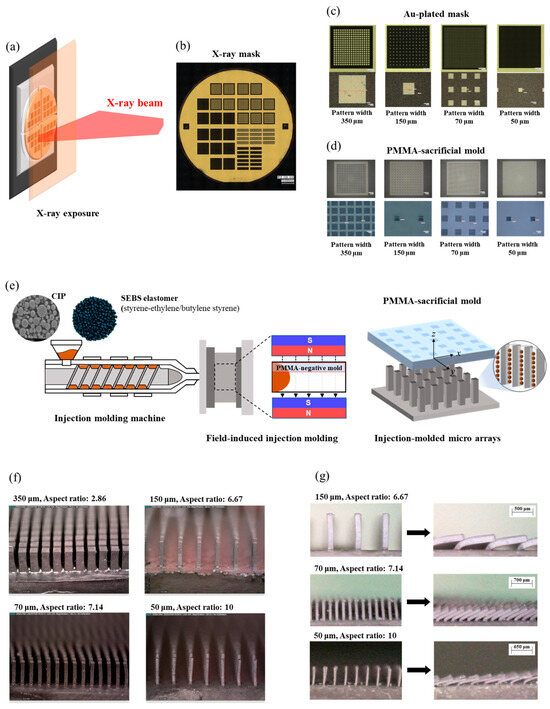 Shin, D.S.; Park, J.W.; Gal, C.W.; Kim, J.; Yang, W.S.; Yang, S.Y.; Kim, M.J.; Kwak, H.J.; Park, S.M.; Kim, J.H. Development of High-Aspect-Ratio Soft Magnetic Microarrays for Magneto-Mechanical Actuation via Field-Induced Injection Molding. Polymers 2024, 16, 3003. https://doi.org/10.3390/polym16213003