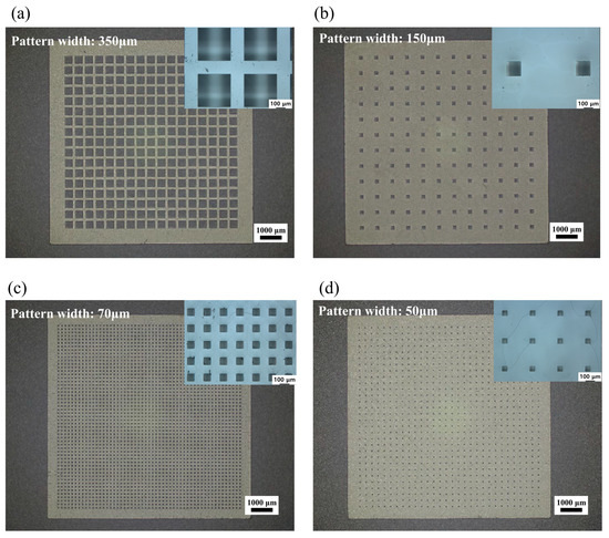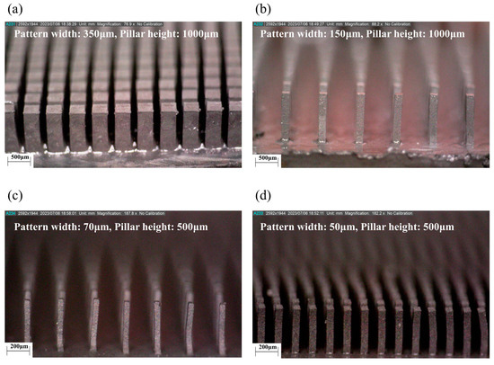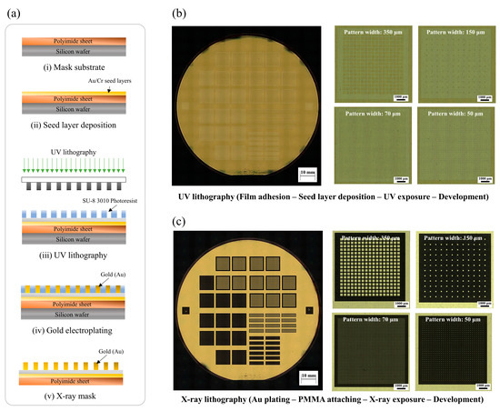 - Park, J.M.; Kim, J.H.; Han, J.S.; Shin, D.S.; Park, S.C.; Son, S.H.; Park, S.J. Fabrication of tapered micropillars with high aspect-ratio based on deep X-ray lithography. Materials 2019, 12, 2056. [Google Scholar] [CrossRef] [PubMed]