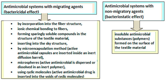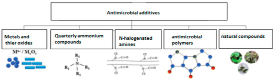 Studies show that microbes on the surface of various materials, including the inner and outer layers of the face mask, can be detected within a period of 4 to 7 days and become a source of transmission of the infection. The moisture accumulated in the capillaries of the mask fiber causes an action by which the trapped microorganisms are transported deeper into the inner layers of the textile and are harmful to human health. Re-aerosolization is possible for a person wearing a mask during intense sneezing or coughing, during which the deposited particles re-enter the body. As the COVID-19 pandemic continues and people continue to wear face masks, there has been an increase in the number of masks worn [11]. One way to reduce the growth of waste medical masks would be to give them antimicrobial properties. This would protect the consumer from microorganisms and secondary infections, prolong the wear time of medical masks, and reduce consumption. The antimicrobial properties of textile face masks can be provided by the introduction of natural and synthetic antimicrobial additives of various chemical compositions (Figure 1).