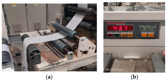 After the best binder was selected, formulations containing the binder and particular antimicrobial additive (Table 1) were prepared and applied on the material using several coating methods: the same screen printing method as it was used in the case of the binder’s compositions; knife-over-roll coating, using a Rotolab Multi 600 pilot continuous coating and laminating machine (Figure 5); and an industrial OMET packaging printing machine equipped with an atmospheric plasma treatment section (Figure 6).