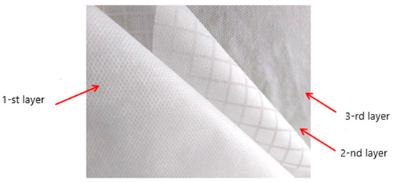 Microbiological studies of the one layer of non-woven PP material with antimicrobial coating showed good antibacterial activity against all three pathogens: E. Coli, K. Pneumoniae, and S. Aureus. MA208499 (Formulation C), MA21466 (Formulation C), and MA892 (Formulation B) refer to the samples coated with silver chloride composition, respectively, with a complete and partial coating of the material surface by a squared pattern or dots pattern. The samples coated with other antimicrobial additives had limited/insufficient or selective antibacterial activity. When analysing the air permeability results of the one-layer samples with antimicrobial coating (Table 11), it was found that the worst breathability—80 mm/s at a pressure difference of 100 Pa—was characterized by sample MA20849 with a continuous coating of silver chloride composition (Formulation C). By summarizing the air permeability of the one-layer samples (Table 10) and the antibacterial efficiency results (Table 9), it can be stated that good antibacterial activity was observed for all three pathogens (Escherichia coli, Klebsiella pneumoniae, and Staphylococcus aureus) and the air permeability (341 mm/s) of sample MA21466 with squared pattern coating of silver chloride composition (Formulation C). Based on the obtained research data, a three-layer medical mask model MA890 was prepared, with the first and third layers consisting of raw non-woven PP material (Table 3), and the second layer consisting of sample MA21466 (Table 6); the air permeability of the M 890 model (Table 12) and the antibacterial activity of both sides (Table 9) were investigated. The arrangement of the non-woven PP material layers in the M 890 layout is shown in Figure 7.