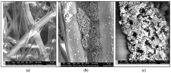 The air permeability of the three-layer medical mask model MA890 measured by the method of EN ISO 9237: 1997 was (140 ± 16) mm/s (Table 12). Scanning electron microscopy (SEM) of the surface morphology of the second layer of the mask model with the squared pattern coating of silver chloride composition (Formulation C) was performed. SEM images (Figure 8a–c) show AgCl particles accumulated on the fiber strands of the second layer of non-woven PP material (Figure 8b,c). Microbiological studies of the three-layer medical mask model MA890 [28] showed good antibacterial efficiency on both sides for all three pathogens (Table 9). Sample MA890, with a plot of squares in the second layer of silver chloride composition (Formulation C) in which the antimicrobial coating coverage deposit was 5.6 g/m2, was found to have good antibacterial efficiency on both sides of the mask for the three pathogens tested (Escherichia coli, Klebsiella pneumoniae, and Staphylococcus aureus).