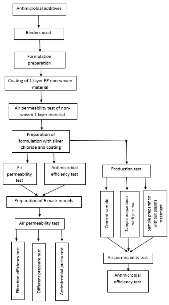 The aim of the present work was to develop and investigate the polymer composition required for the coating with silver (Ag) nanostructures, which gives the non-woven PP material antimicrobial properties; to investigate the air conductivity of one-layer fabric to intend to choose the particular fabric for a medical mask model; to investigate the antibacterial properties of coated non-woven PP material; to test polymer composition coating technology on non-woven PP material; and to investigate the air conductivity and antimicrobial efficiency of the face mask model used for the production of disposable medical masks.